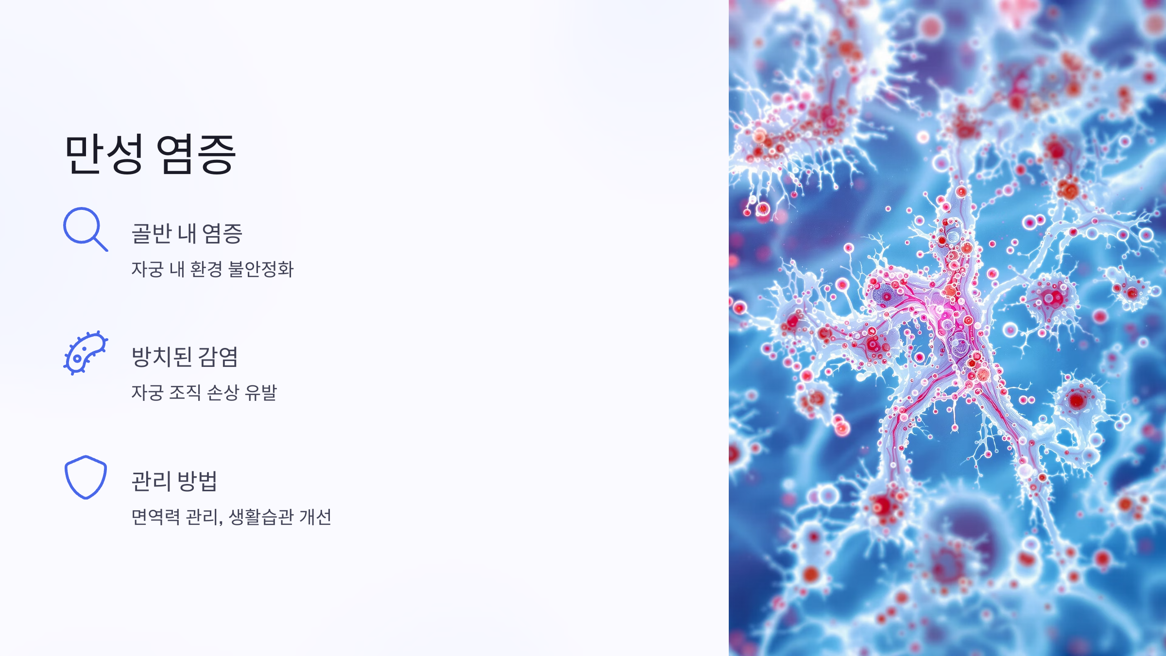 자궁내막염, 골반염, 난관염 같은 만성 염증이 반복되면 자궁 내부 환경이 불안정해져 물혹이 생기기 쉬워요. 특히 감염이 방치되면 조직 손상으로 이어져 낭종이 형성될 가능성도 높아지죠.