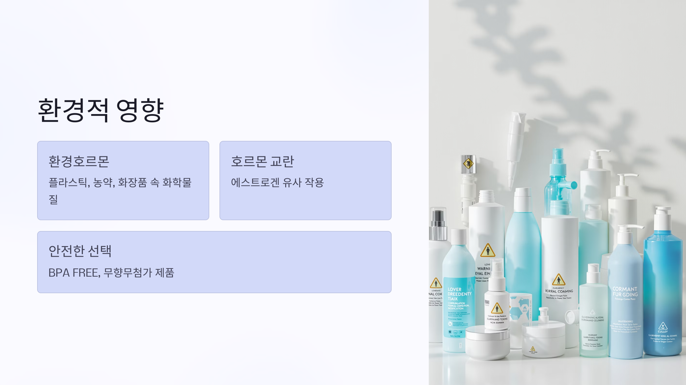 요즘 특히 주목받는 자궁 물혹의 원인 중 하나는 환경호르몬입니다. 플라스틱 용기, 가공식품, 화장품 속 화학성분들이 내분비계를 교란해 에스트로겐 유사 작용을 일으키는 거죠.